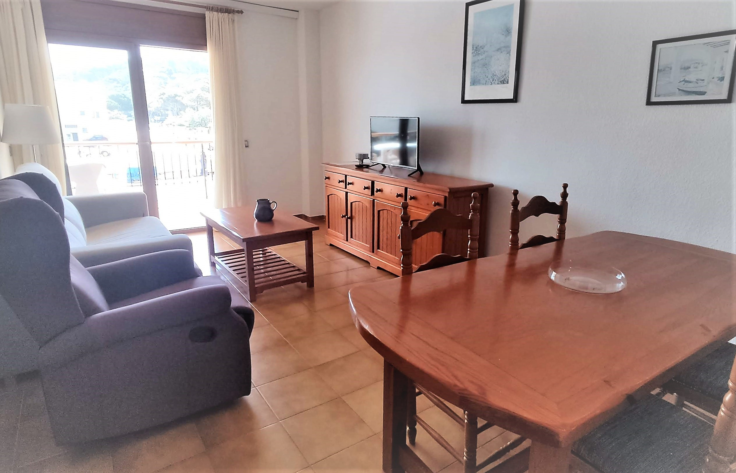 - El saló-menjador inclou un sofà-llit, ampliant la capacitat a dues persones més, i té accés directe a la terrassa privada moblada, un espai perfecte per gaudir de les vistes al mar.
