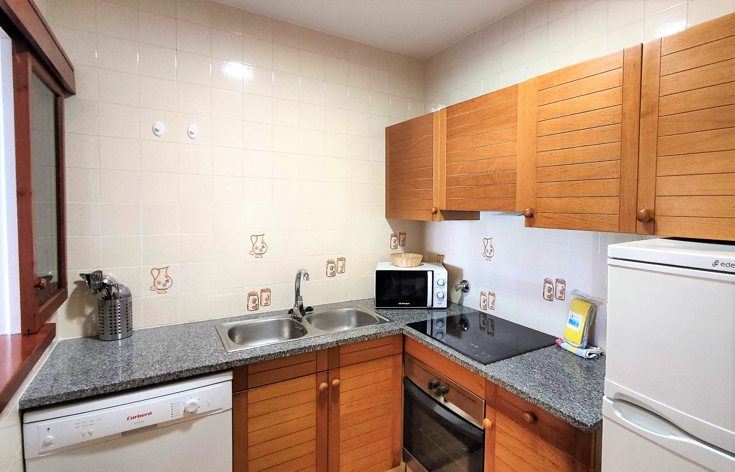 - La cuina està equipada amb placa vitroceràmica, nevera, congelador, microones, forn, rentaplats, cafetera de filtre, torradora, bullidor i estris de cuina complets.