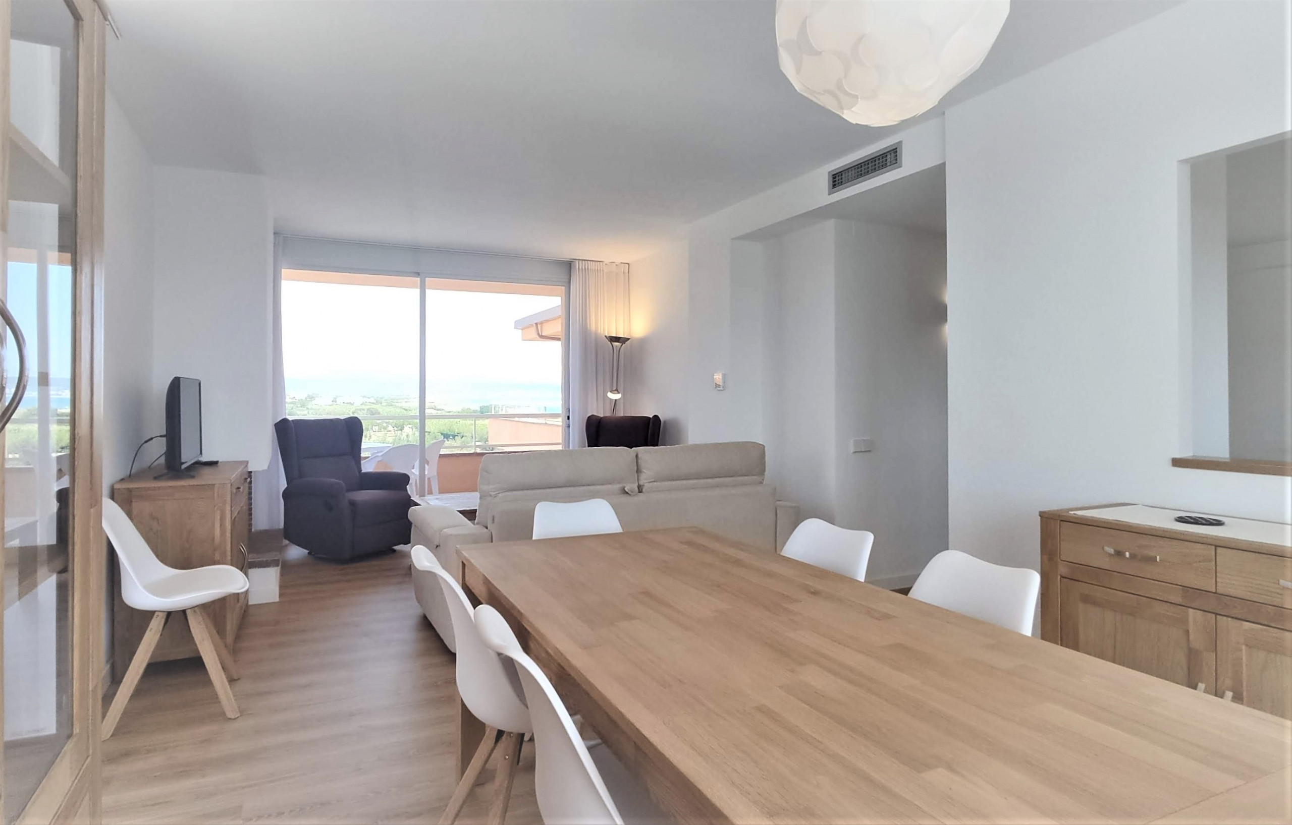 Espacio amplio y acogedor con sofás, televisión y acceso directo a la terraza con vistas al mar.